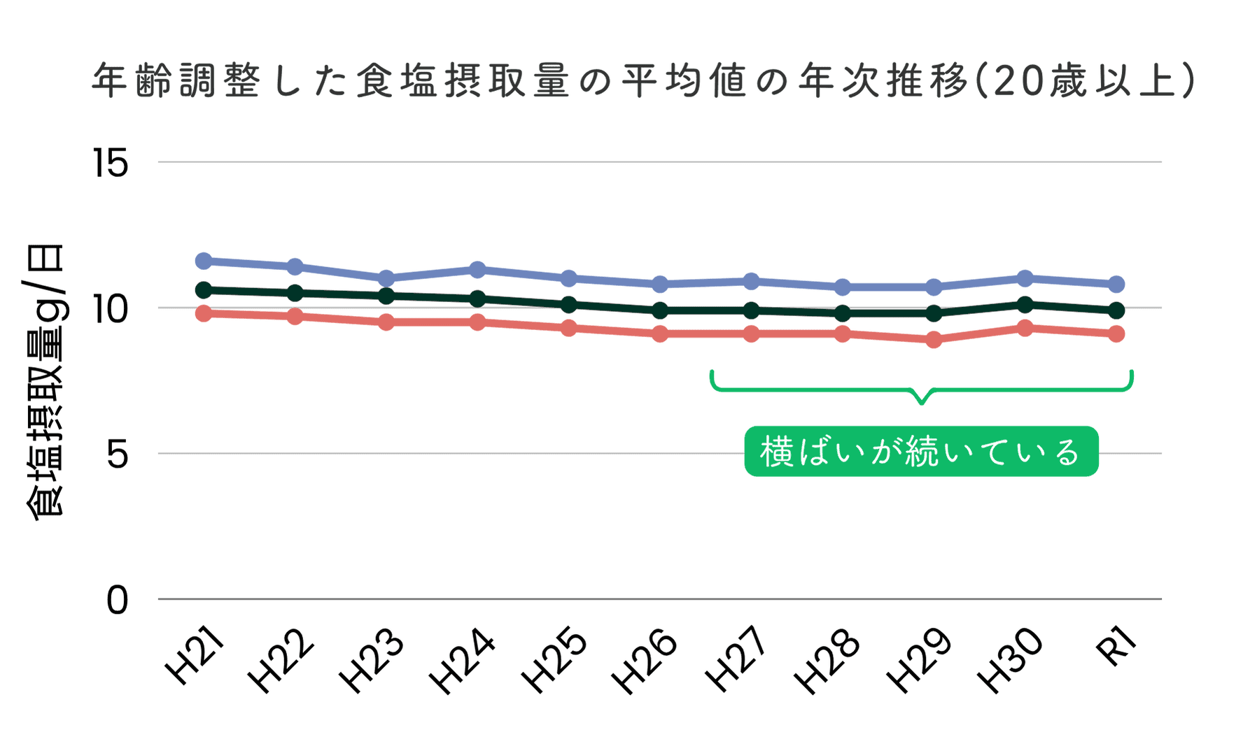 一方、健康を維持するための目標値は男性7.5g未満、女性6.5g未満とされており、私たちは日々、目標よりも約3〜4gも多い塩分を摂取しているのが現状です。過去10年間の推移を見ても、日本人の食塩摂取量は「横ばい」が続いています。